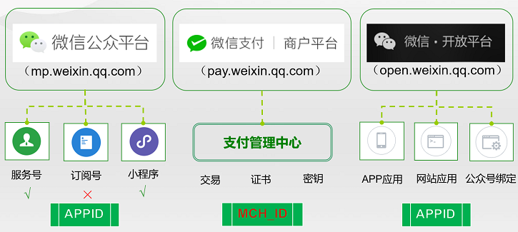 在接入微信支付过程中,会出现APPID、MCH_ID、公众平台、开放平台、商户平台等概念,下面仅从微信支付的角度来做简单分析: