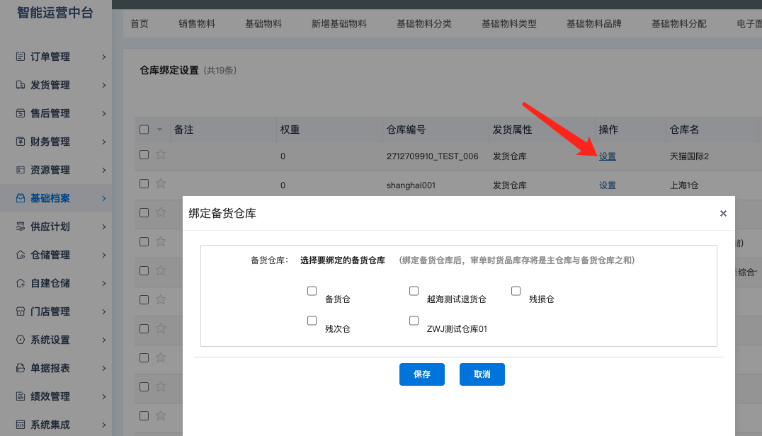 操作路径:【基础档案】—【仓库物流管理】—【仓库绑定设置】