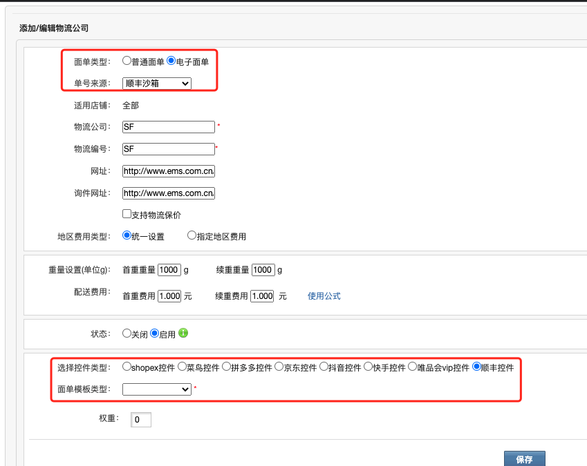 - 在物流公司的设置时候,主要还可以设置配送费用,可以是固定的运费,也可以是根据具体重量相关的公式计算出来的运费