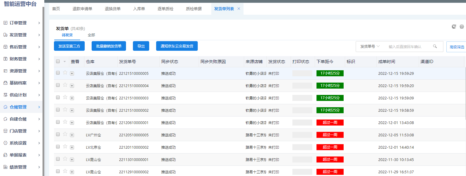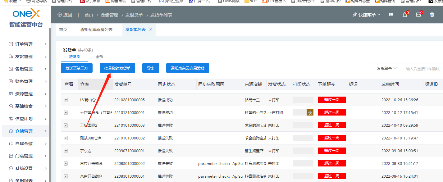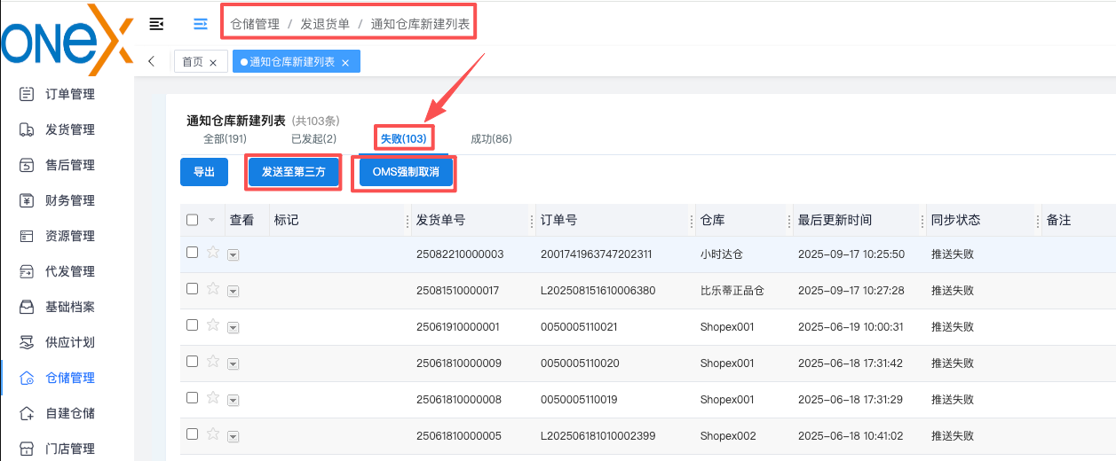 - 在【通知仓库新建列表】里,可选择同步第三方WMS【失败】的发货单列表页,并针对推送失败的发货单,点击【发送至第三方】,重新推送发货单,或者点击【OMS强制取消】,取消选中的发货单。