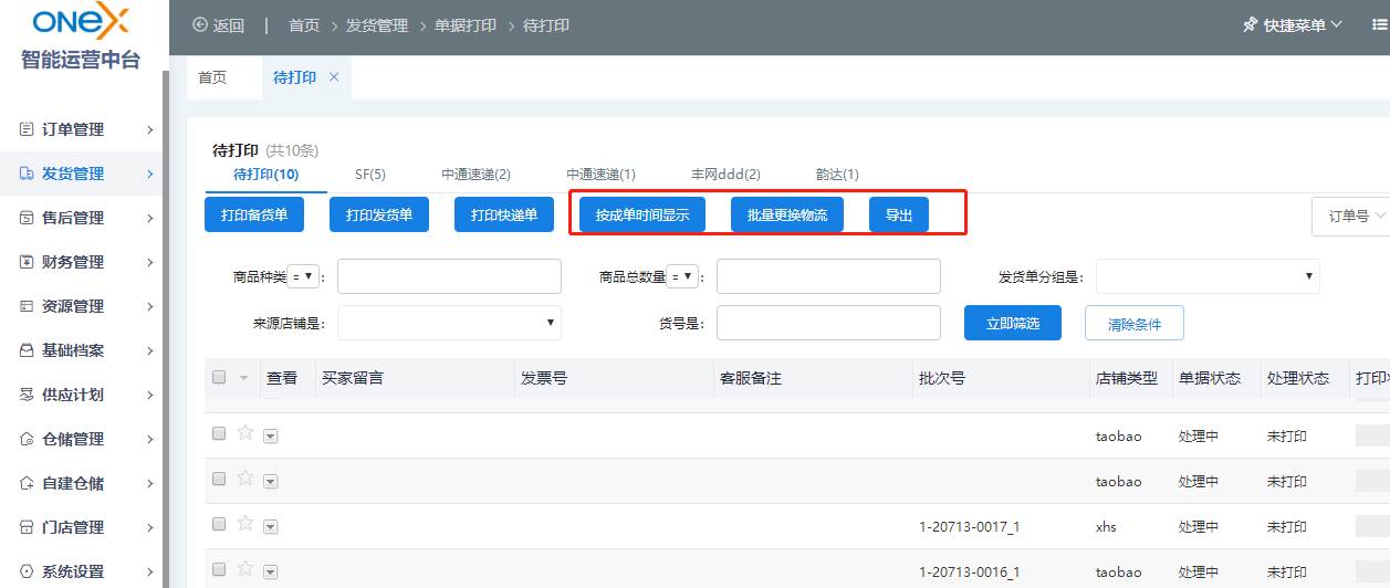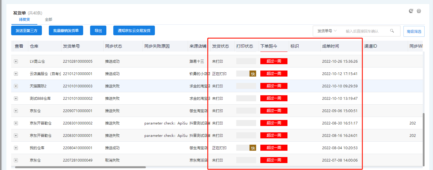 - 可查看发货单当前【发货状态】、【打印状态】、【仓库】、【物流公司】、【来源店铺】等信息。