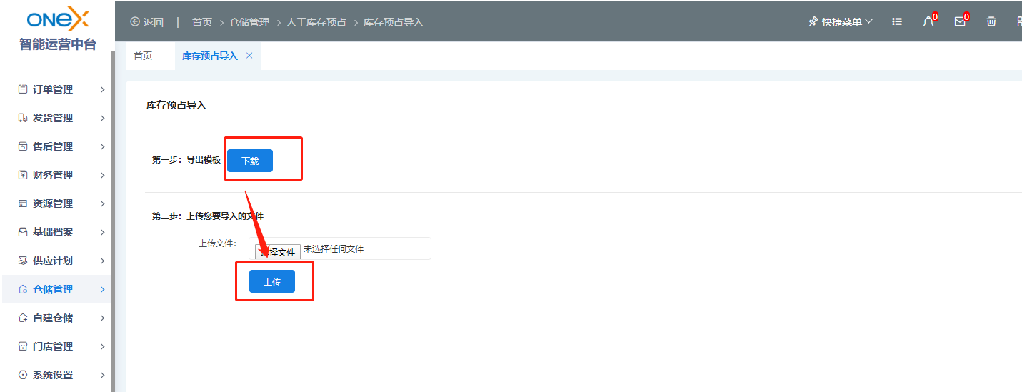 操作路径:【仓储管理】—【人工库存预占】—【库存预占导入】