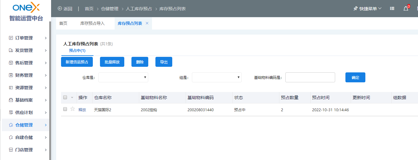 操作路径:【仓储管理】—【人工库存预占】—【库存预占列表】