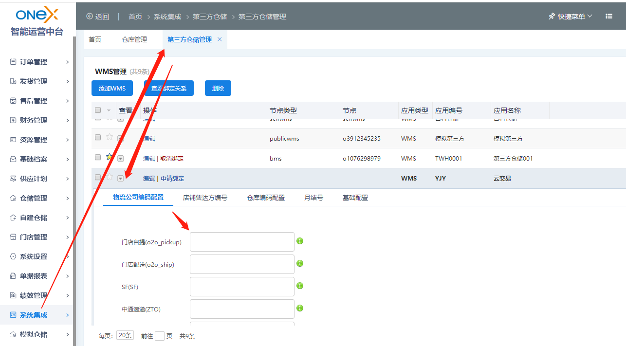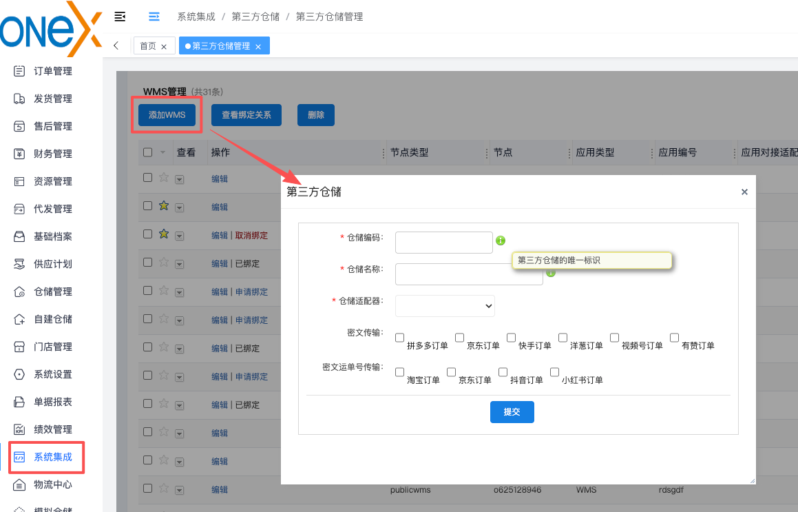 第三步,【系统集成】-【第三方仓储】-【第三方仓储管理】添加wms