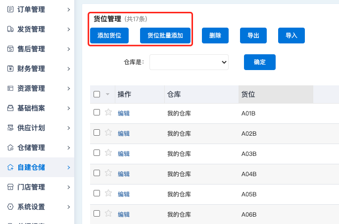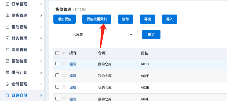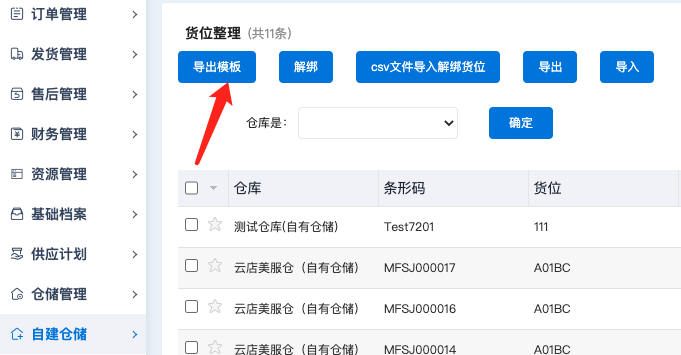 在【自建仓储】-【日常管理】-【货位整理】点击“导出模板”下载表格模板