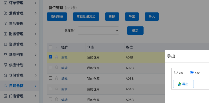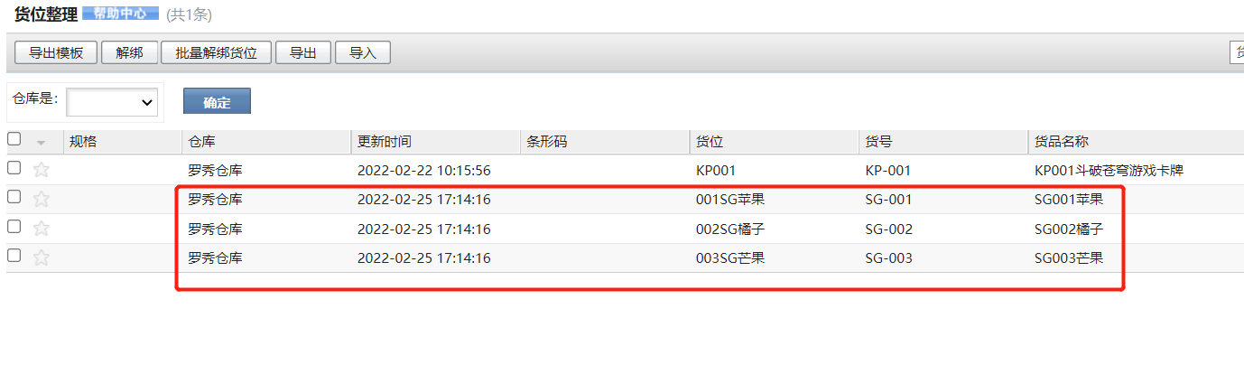导出:选择多条数据,以表格的形式导出来查看仓库各个货位绑 定的商品