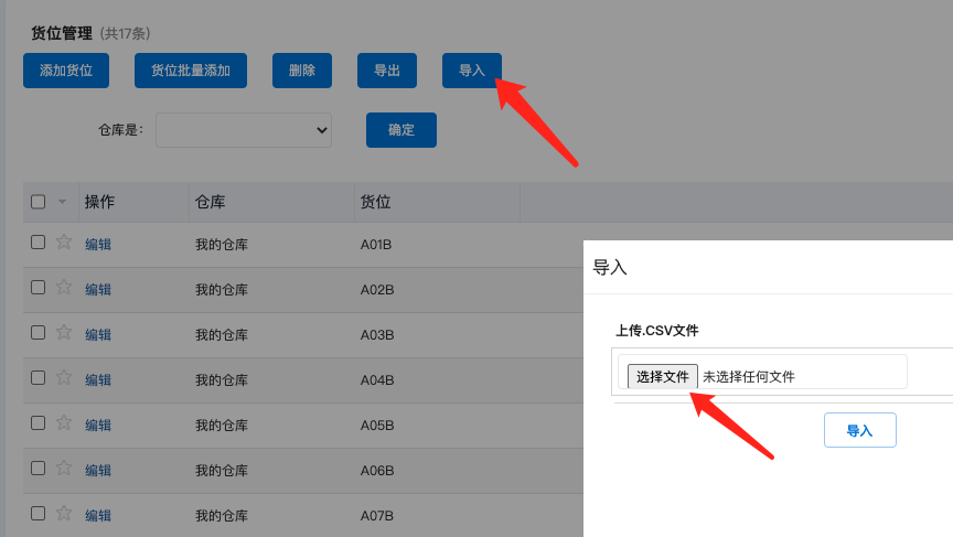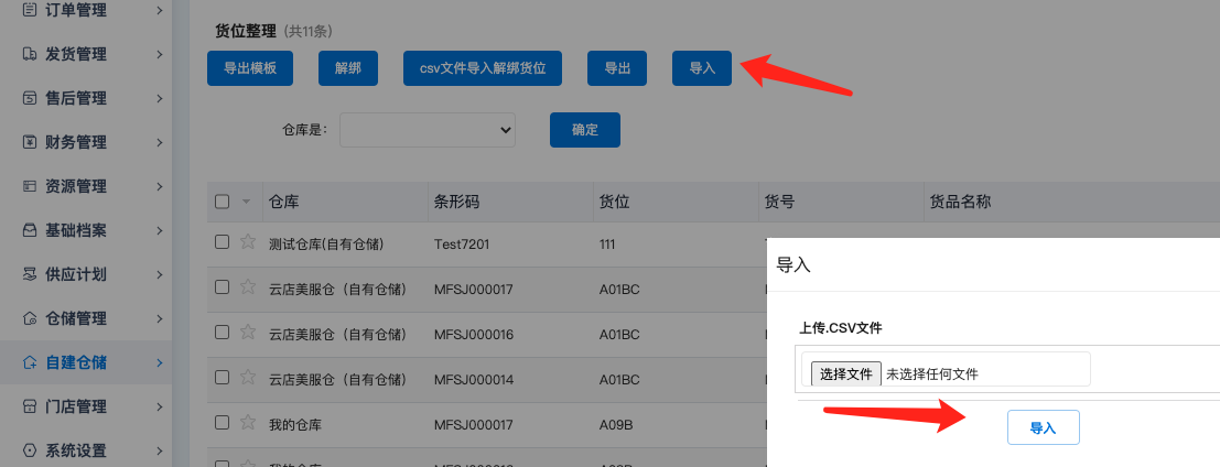 在表格模板内填写、货位名称、货品名称、货号、所属仓库保存后导入,如下图: