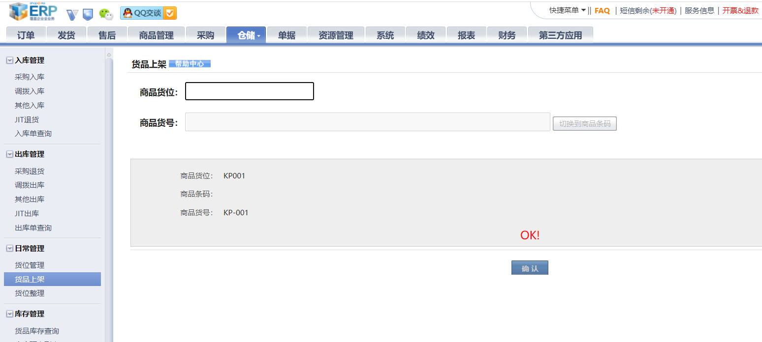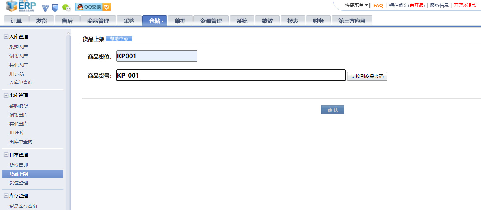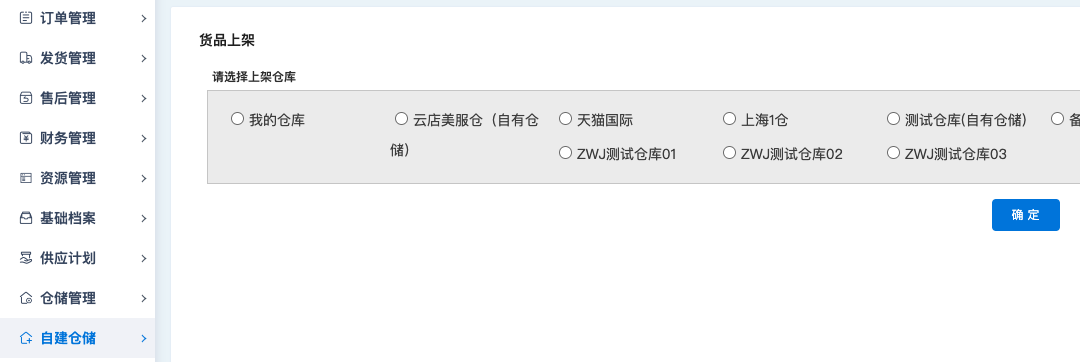 在【自建仓储】-【日常管理】-【货位上架】选择上架的仓库,点击“确认”