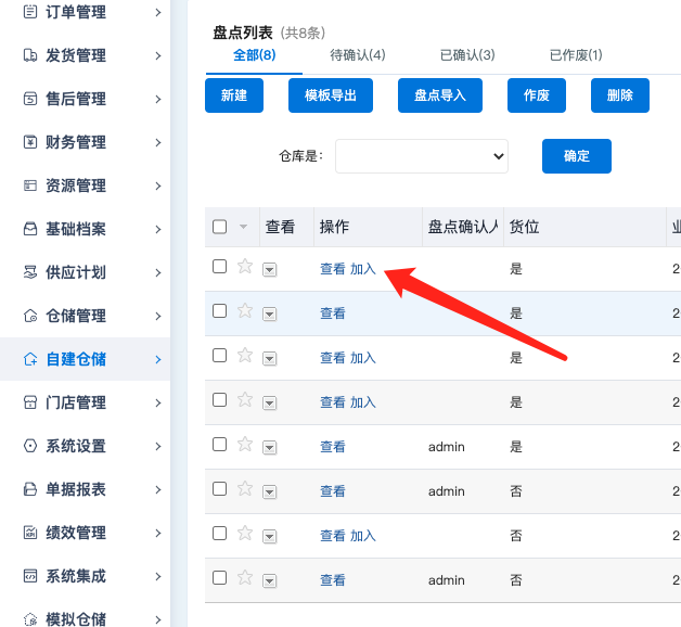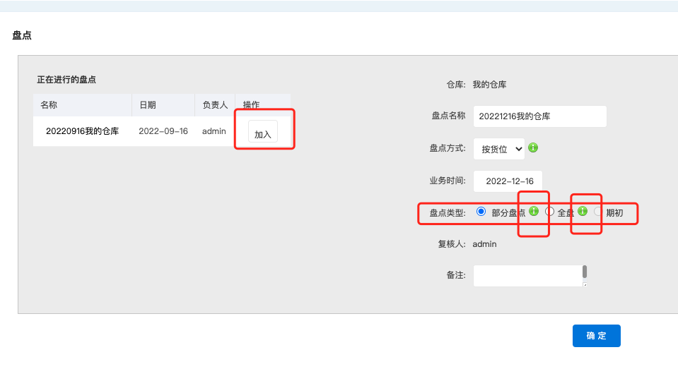 - 新建盘点任务的仓库,已有正在进行的盘点任务,则可以快速“加入”对应的任务。