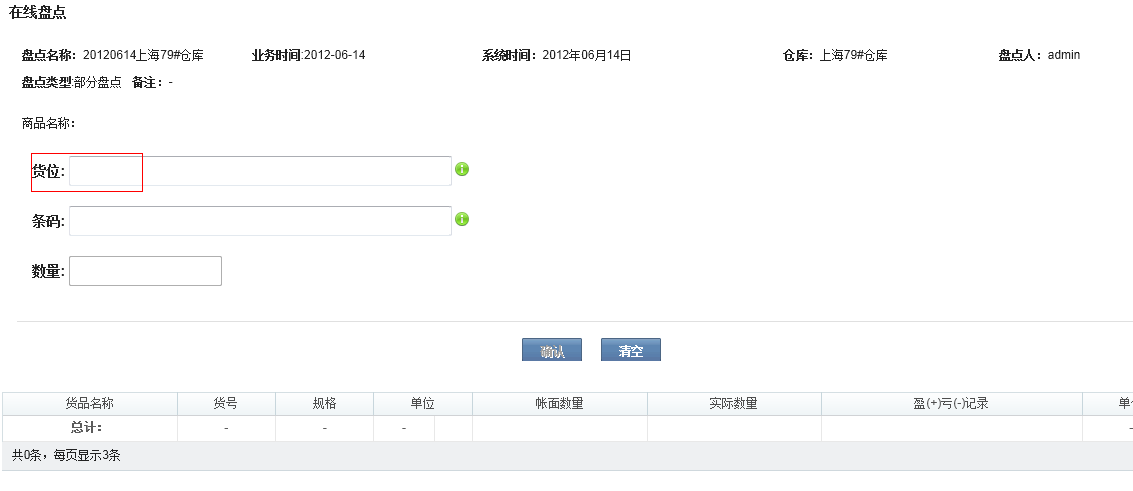 - 多人(或一人)进行盘点时,当同一个货位上的同一个货品进行重复录入时,系统会以最终一次盘点的结果为准‘