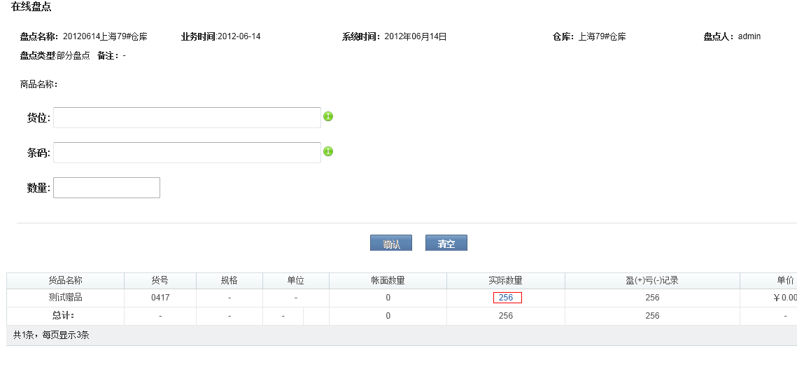 - 多人(或一人)进行盘点时,当不同货位上的同一个货品进行录入时,系统会进行累加,最终的库存为累加后的库存