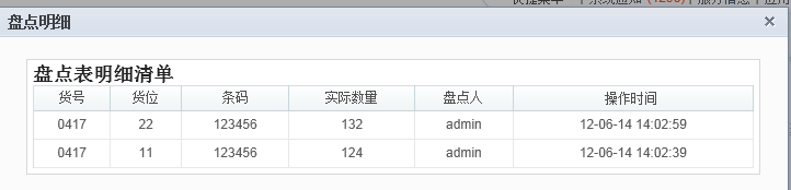 - 点击“实际数量”上面的链接,可以进行此货品的明细进行查看。可以查看此货品在不同货位上的盘点数量。