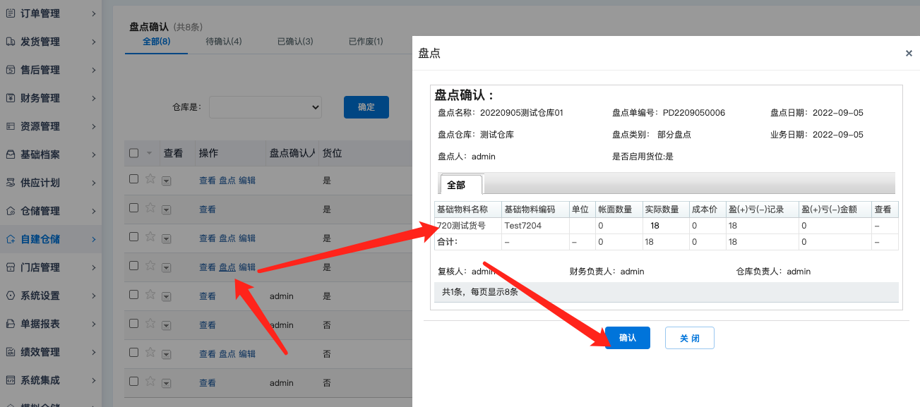 - 盘点确认时,点击“盘点”进行盘点仓库的对应货品的库存调整。