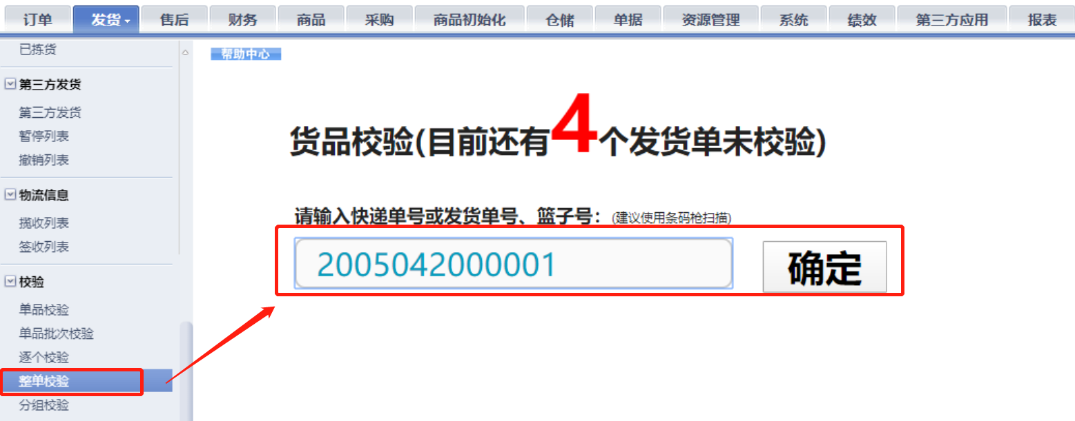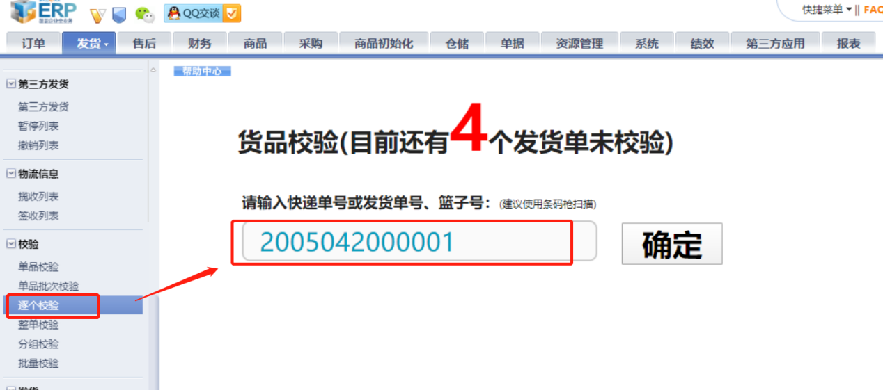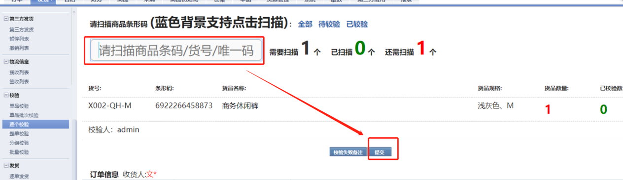 9、逐个校验:打印发货单完成后校验商品配货唯一码录入。