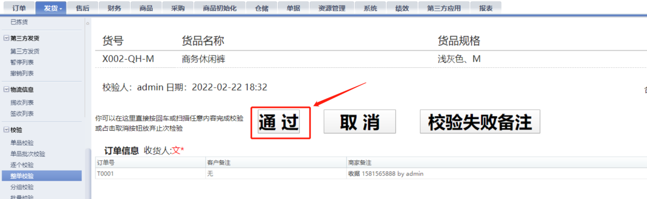 - 分组校验:仅把发货单的状态变成已校验的状态,不通过人为或条码的校验。