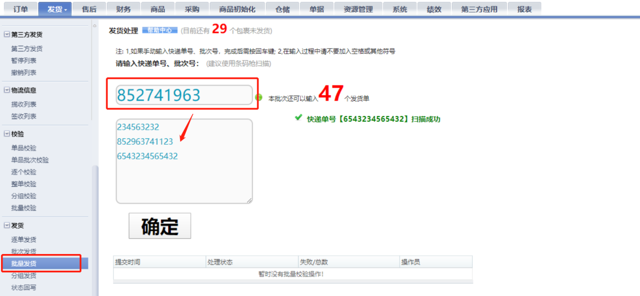 - 批量发货:可输入多个快递单号(一次最多输入50个快递单号,可用扫码枪扫码快递单号或手动输入快递单号后按下回车键),进行批量发货。这里无需称重(重量按录入商品时的重量计算)
