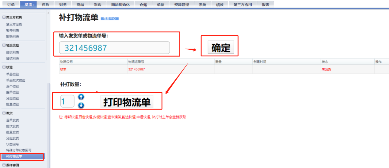 - 补打物流单:针多一个包裹无法打包时,需要多个包裹发货,可通过补打快递单打印多个物流单号。