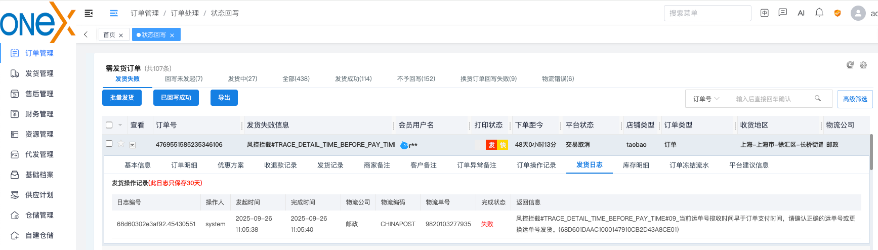 - 状态回写:查看已发货的订单,物流单号是否成功回写至前端店铺。