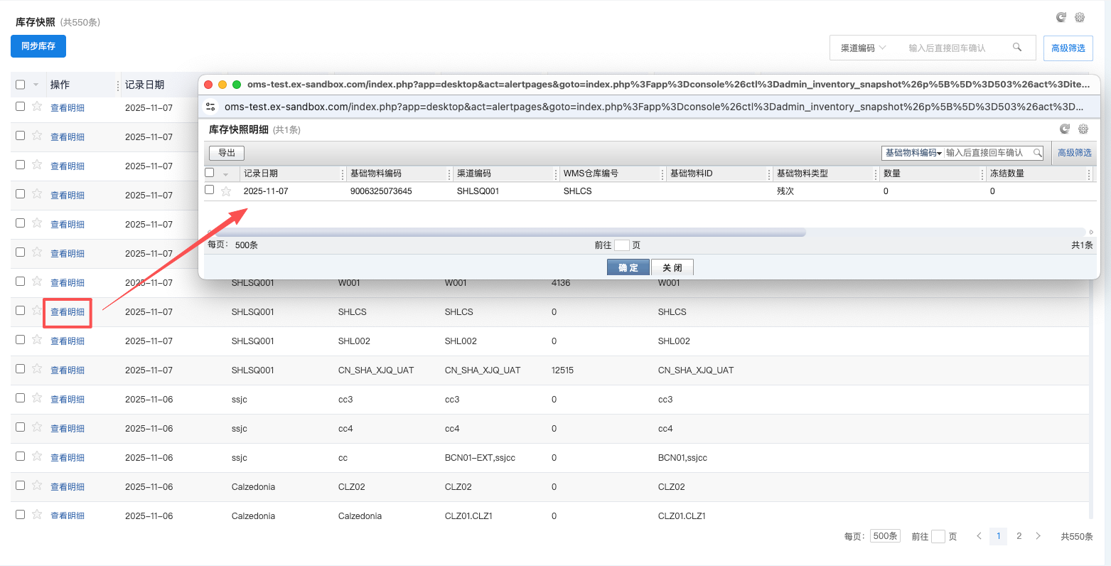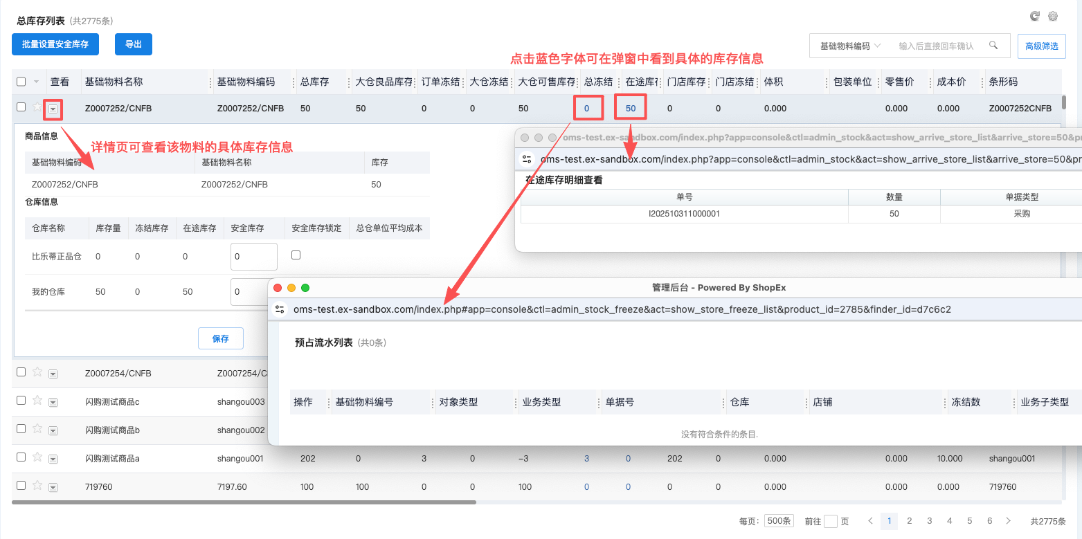 点击倒三角图标可查看显示商品在各个仓库的库存数量,冻结库存,在途库存等信息