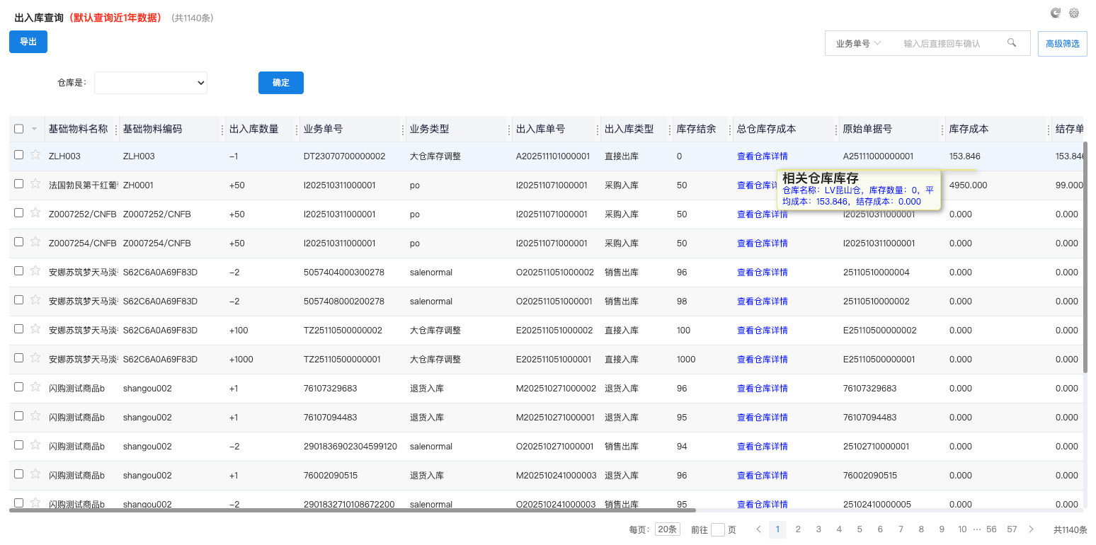 功能介绍:****查看系统内所有基础物料的出库入库单据明细。鼠标移动到“查看仓库详情”,会展示相关仓库的库存。