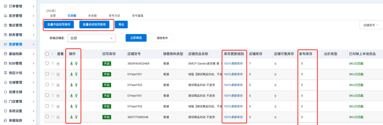 :同步货品操作,将前端货品数据,如店铺货号、货品名称等,同步到本地系统。- 控制每个商品的回写库存状态