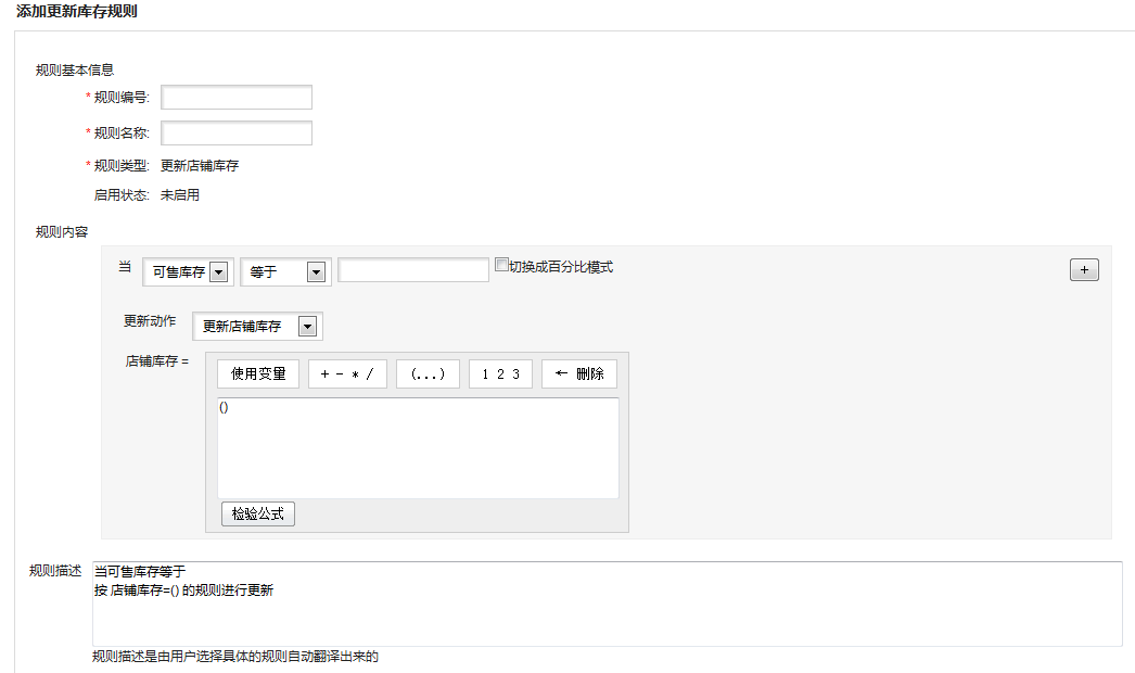 - 填入规则内容:分为触发条件、更新动作、店铺库存更新结果。