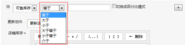 - 触发条件:当可售库存在一定的范围内,将触发规则进行店铺库存的更新。同时,也提供百分比模式。条件可以添加多条,同时满足条件时,才会触发规则。