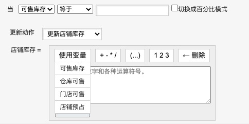 - 店铺库存:设置更新店铺库存的值,可以根据需求自行设定这个数值,系统提供变量,以及基本的算术逻辑。最后可校验公式是否符合语法规则。