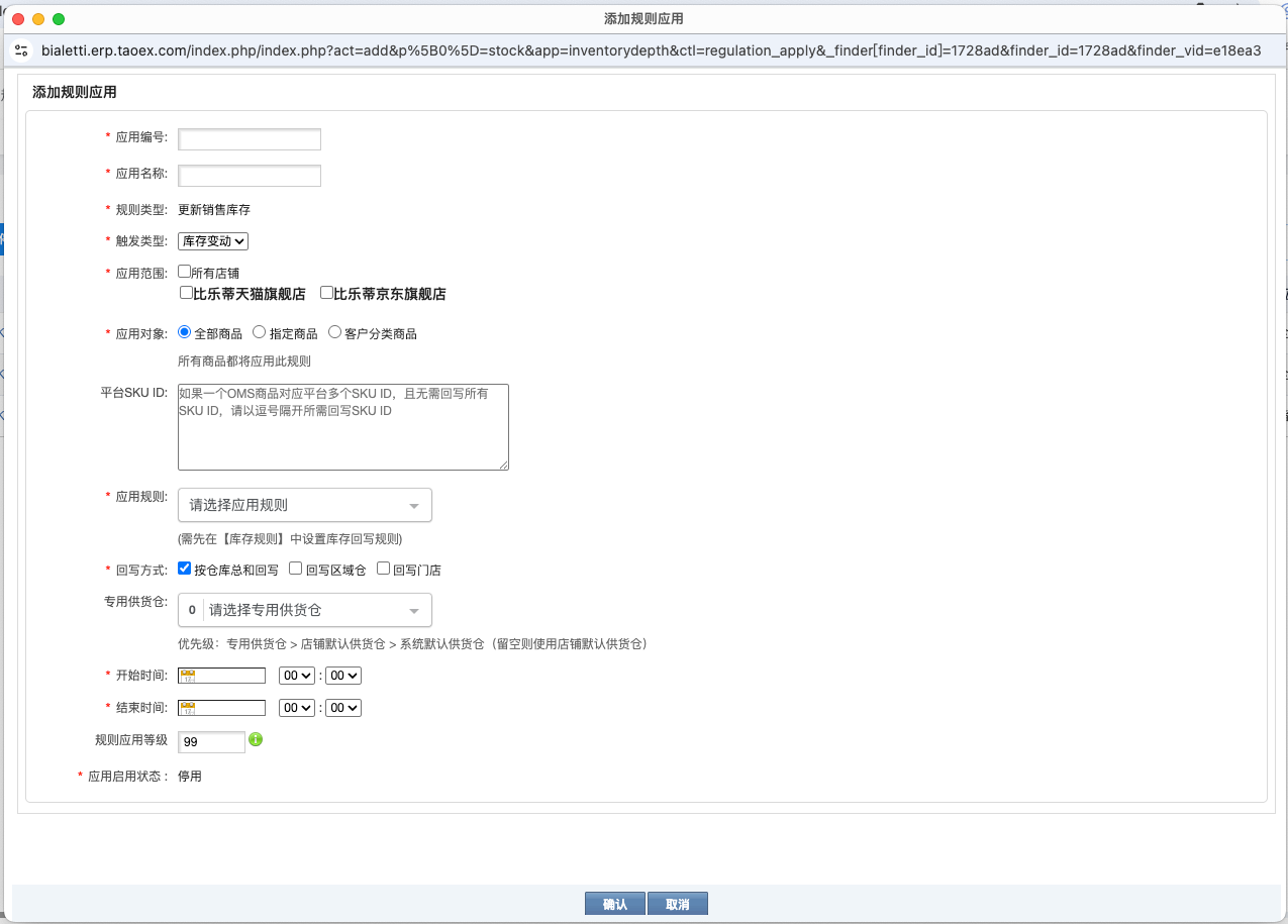 - 应用规则:选择在“库存规则”内设定的规则,规则必须是开启状态,且只能选择一条规则。