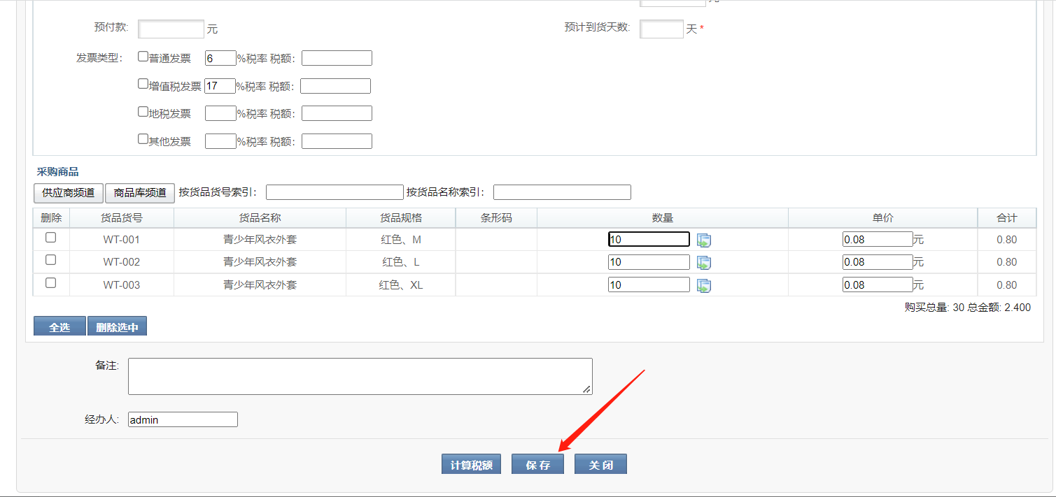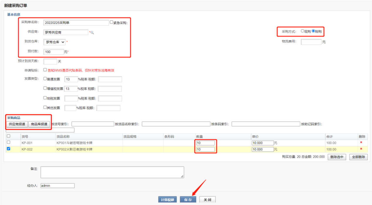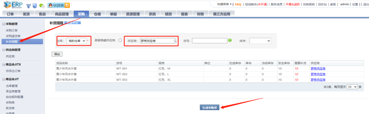 选择仓库和供应商,点击生成采购单,一键生成采购单,并点击保存,如下图: