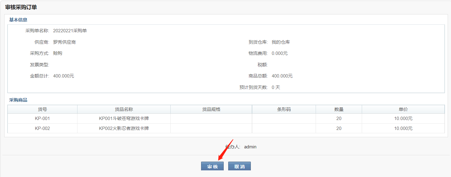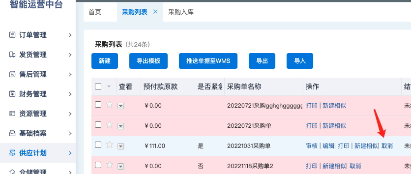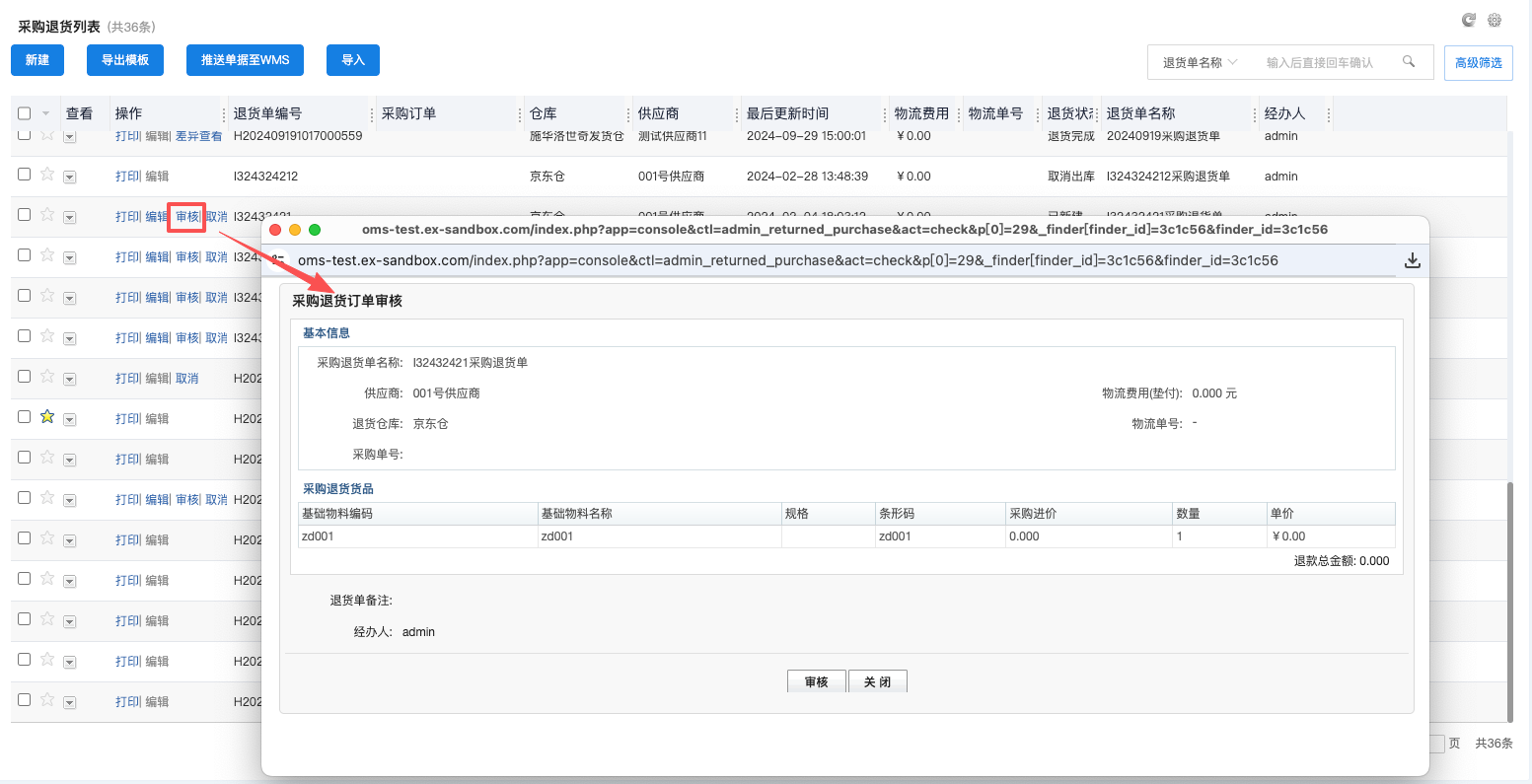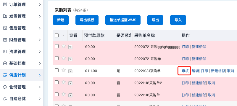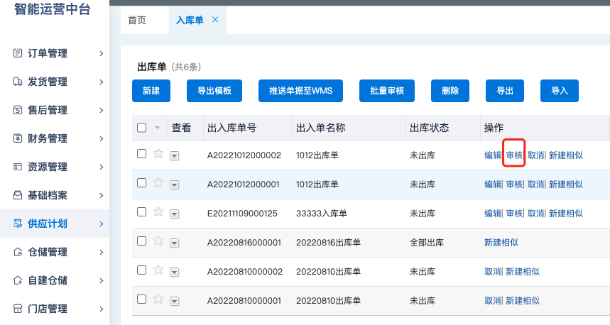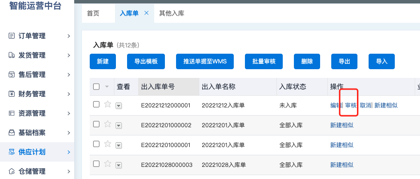 采购负责人在“供应计划-采购退货单”点击审核,确认采购的商品无误后,点击“审核”推送到仓库