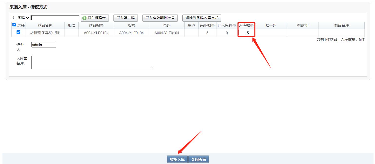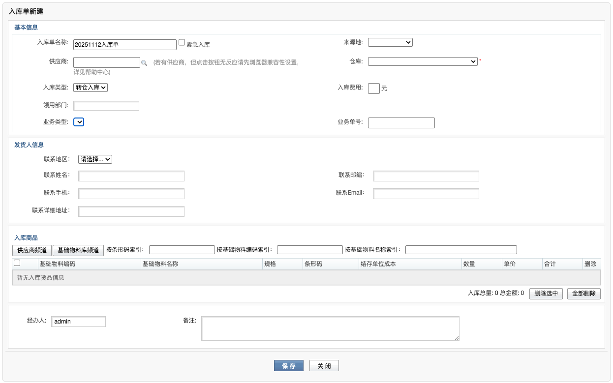 出库类型(必填):选择入库的类型,入库的类型:直接入库,调账入库,赠品入库,样品入库