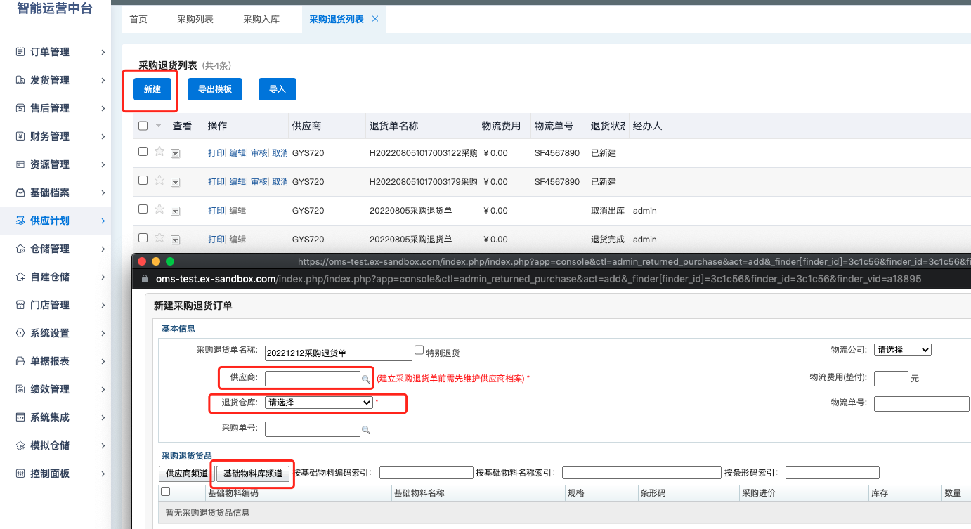 采购退货单名称(必填):采购退货单在OMS系统内显示的名称