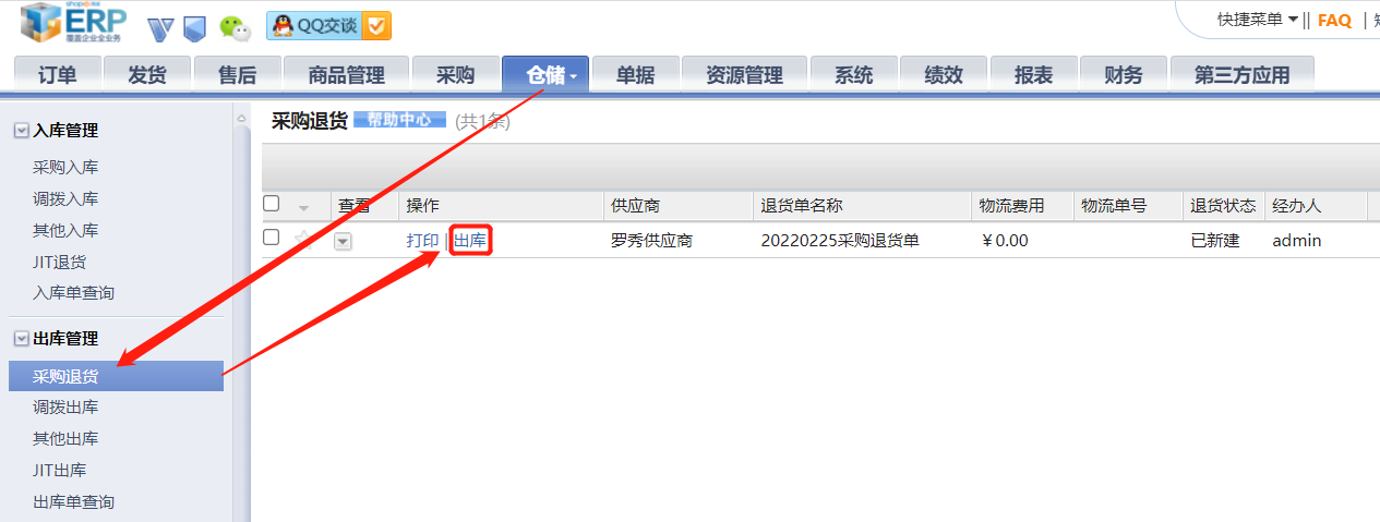 功能详细:采购退货单审核通过后,仓库管理人员对商品进行出库。此功能仅适用于使用【自建仓储】模块,第三方仓WMS通过接口回传采购退货单据。
