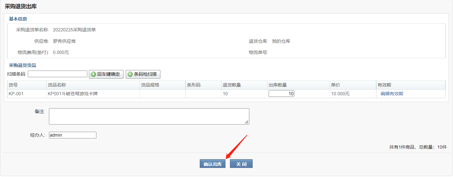 在【自建仓储】-【出库管理】-【采购退货】点击出库,确认出库商品和数量无误后点击“确认出库”