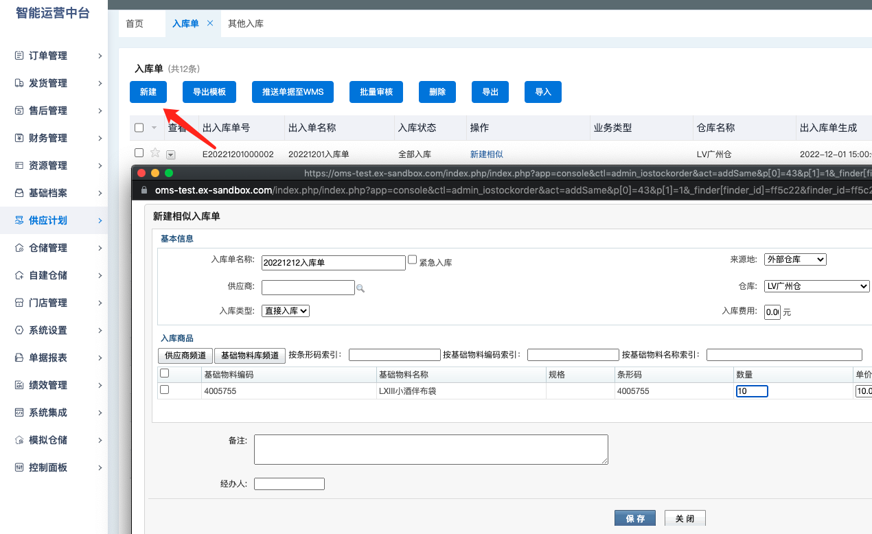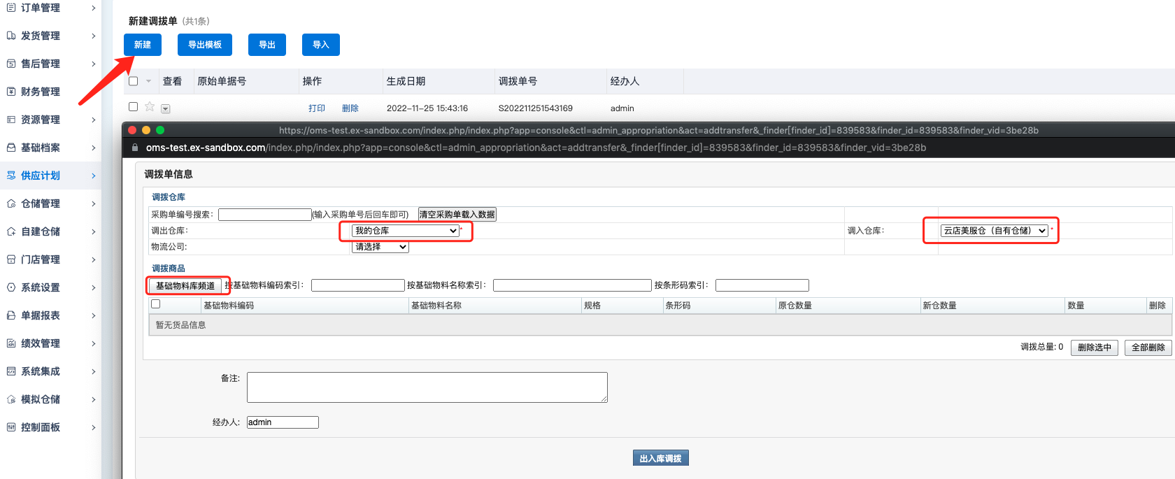仓管人员在【供应计划】-【调拨计划】-【新建调拨单】点击“新建”,新建调拨单