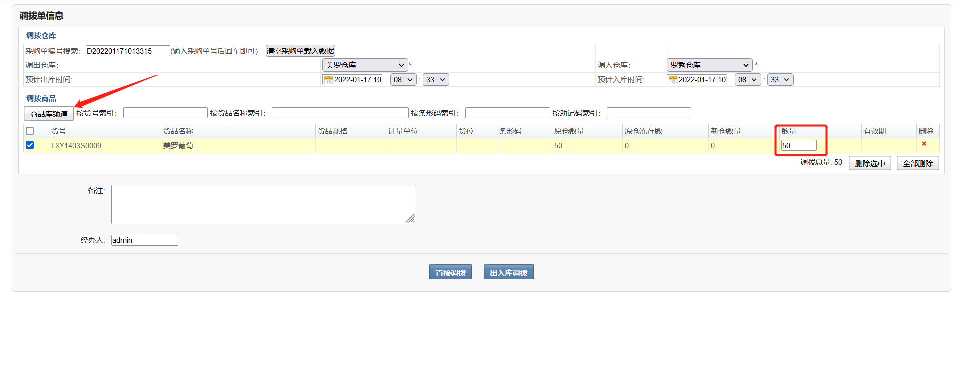 点击“商品库存频道”选择调拨出入库的商品,输入调拨的数量进行调拨