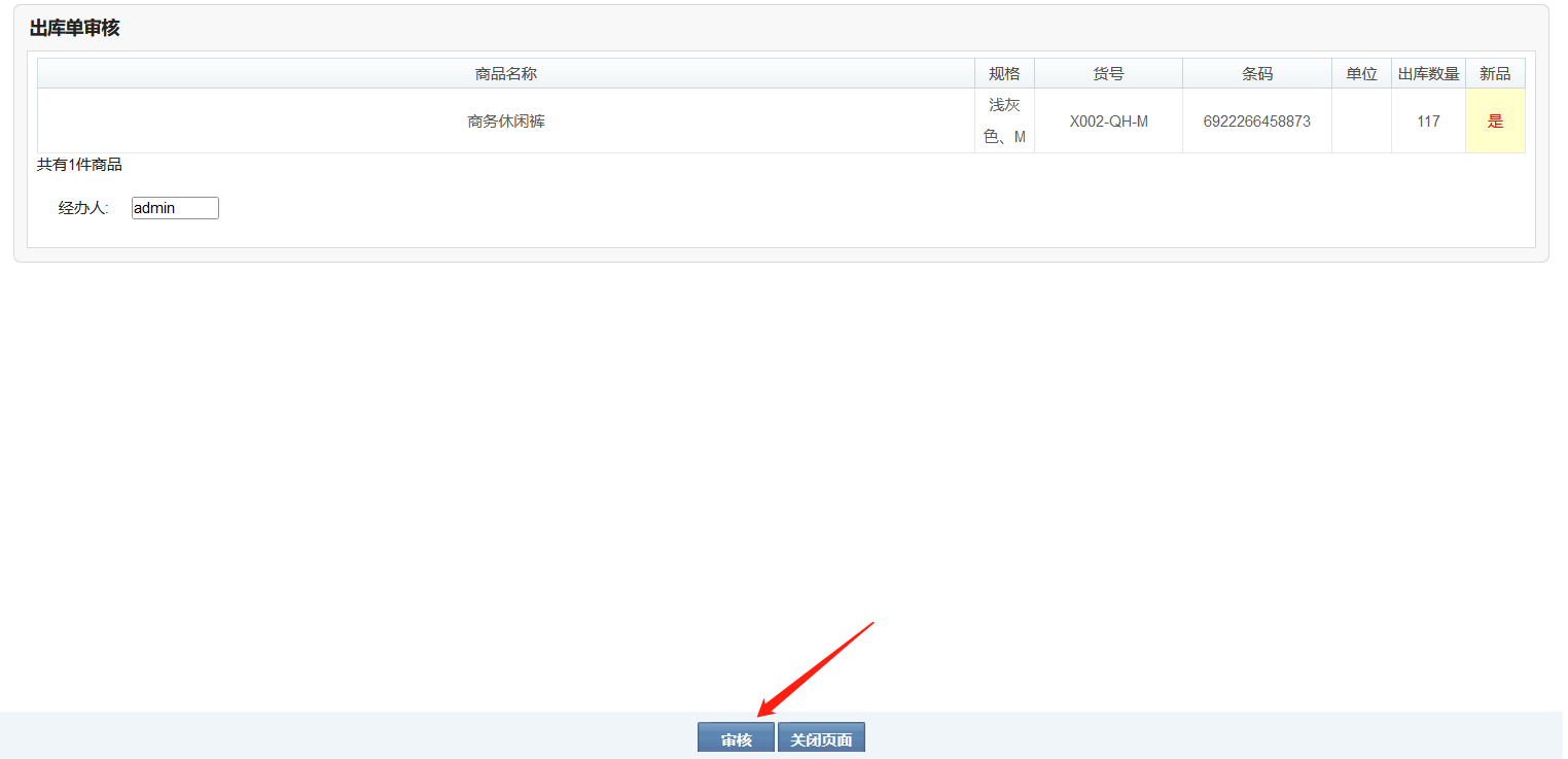 仓库管理员在【自建仓储】-【出库管理】-【其他出库】该出库单点击“审核”,确认其他出库单信息无误后点击“审核”