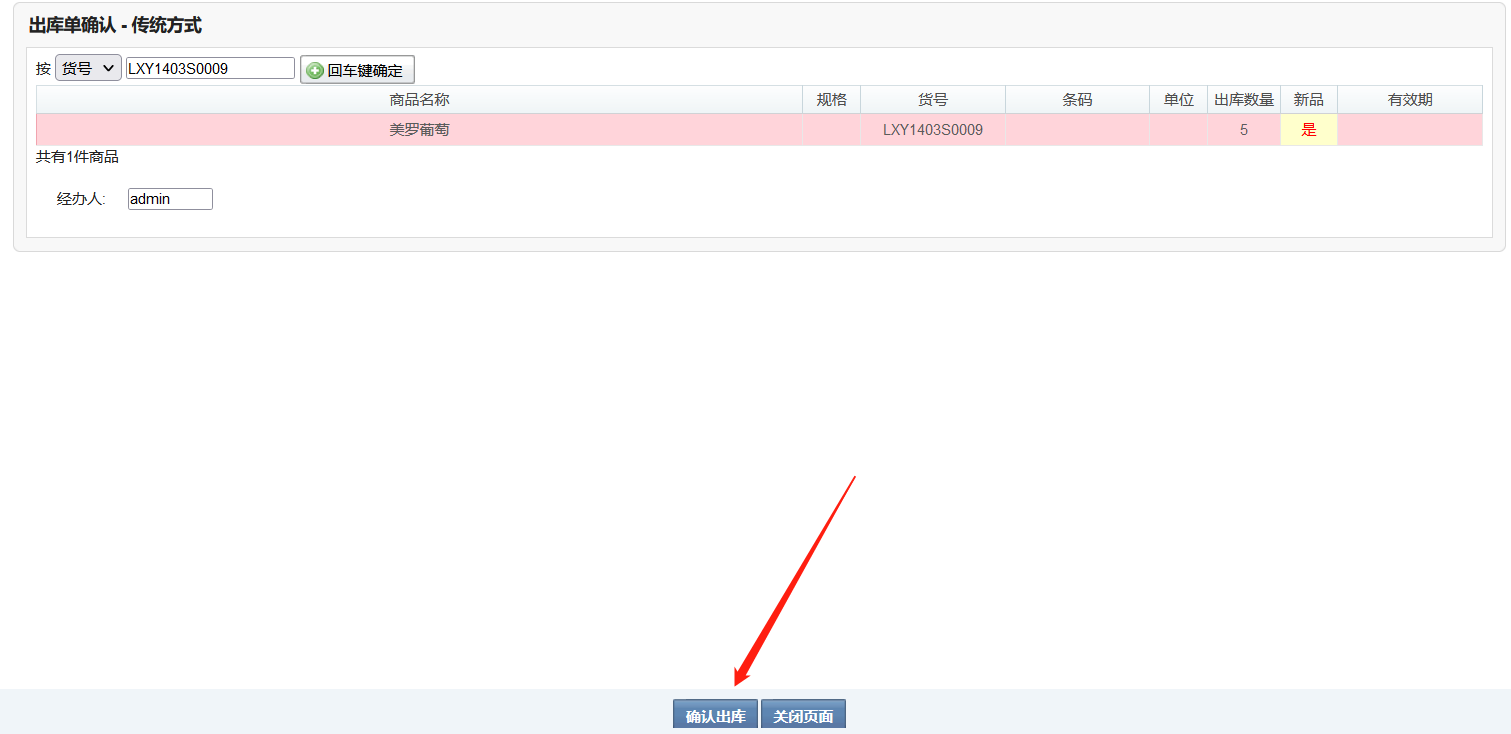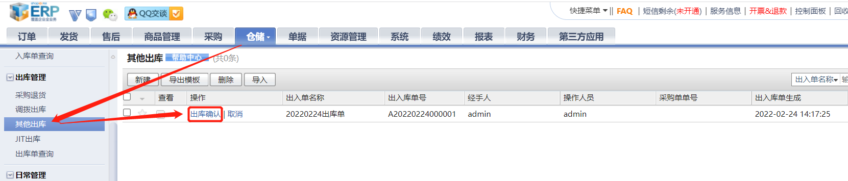 其他出库单审核通过后,仓库管理人员按照其他出库单对商品进行出库后,在【自建仓储】-【出库管理】-【其他出库】该出库单点击“出库确认”,完成其他出库单