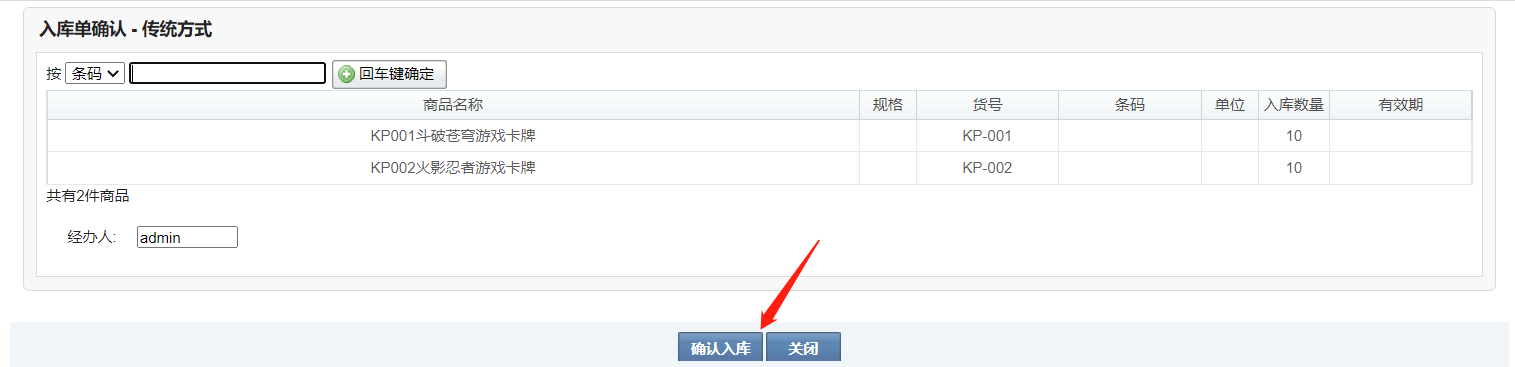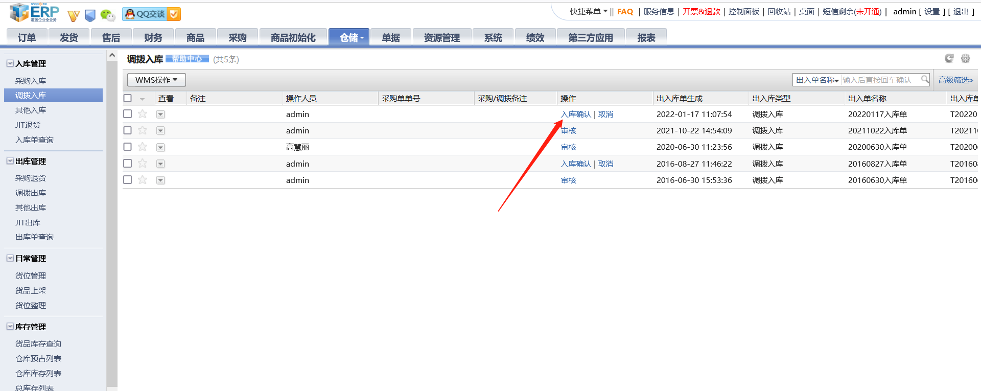 调入的仓库管理员收到货,清点入库商品确认无误后录入仓库,在【自建仓储】-【出库管理】-【调拨入库】该调拨单,点击“入库确认”,完成调拨入库单