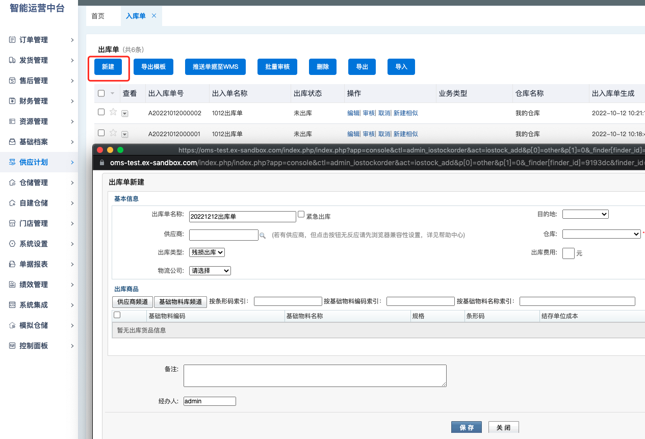 仓库管理员在【供应计划】-【出入库计划】-【出库单列表】,点击“新建”