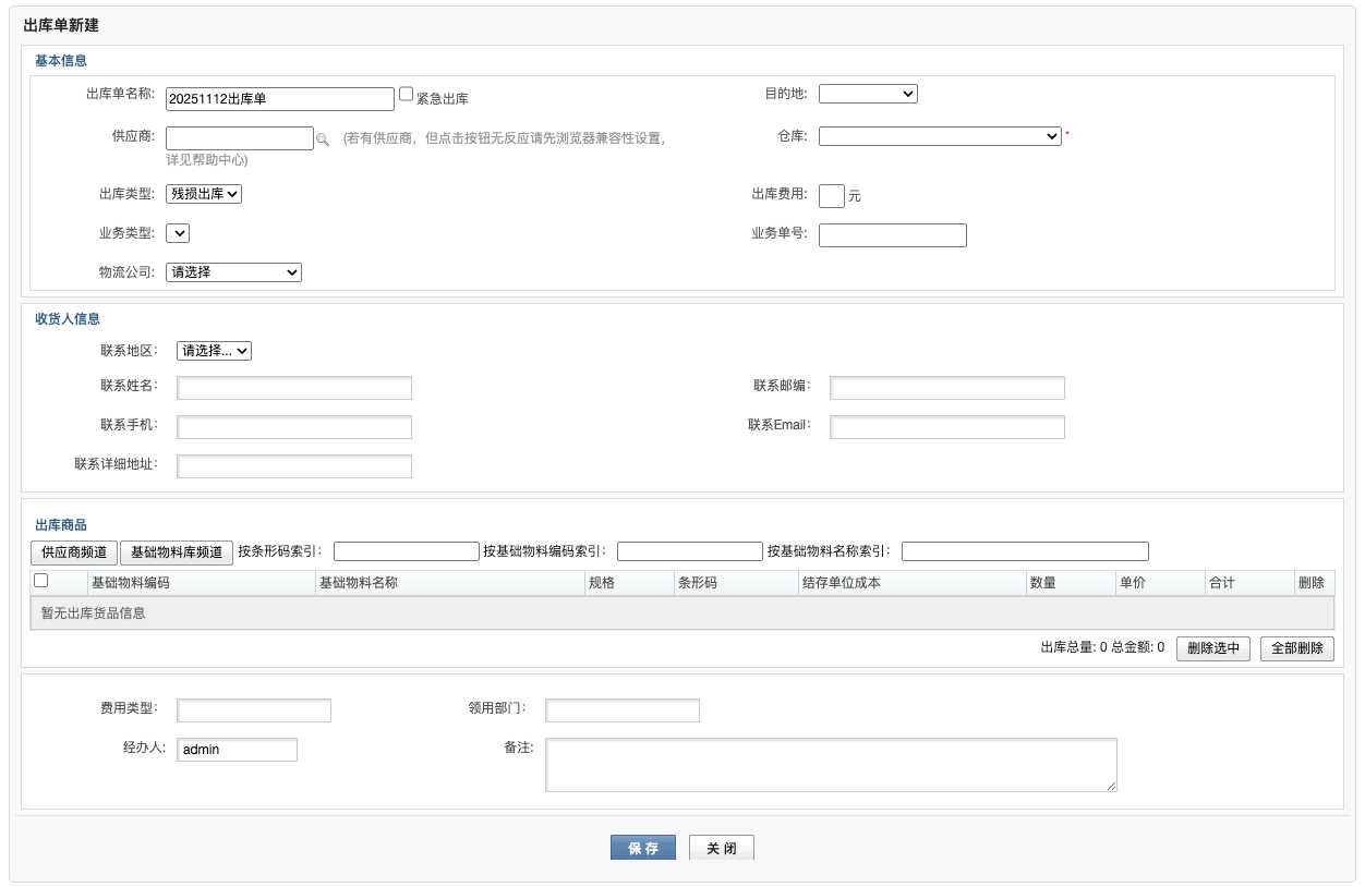 仓库管理员选择入库的仓库,入库类型,点击供应商频道或者商品频道,添加出库的商品以及商品数量,点击保存新建其他出库单