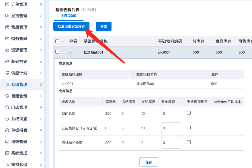在【仓储管理】-【库存】-【总库存列表】选择需要设置安全库存的商品,点击批量操作-批量设置安全库存,批量设置安全库存的方式主要有以下两种: