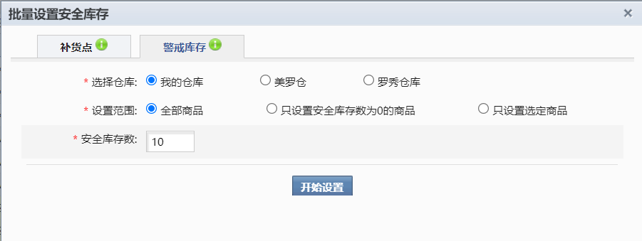 选择对应的仓库和商品,并设置好警戒的安全库存数,点击开始设置