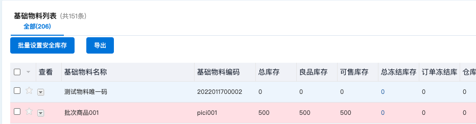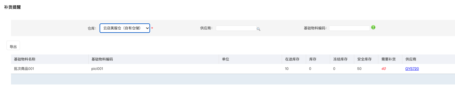 安全设置好了之后,系统会在【仓储管理】-【库存】-【总库存列表】当中标红警示和在【供应计划】-【采购管理】-【补货提醒】进行提示,如下图: