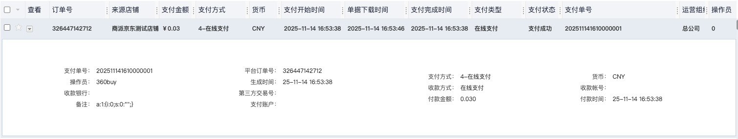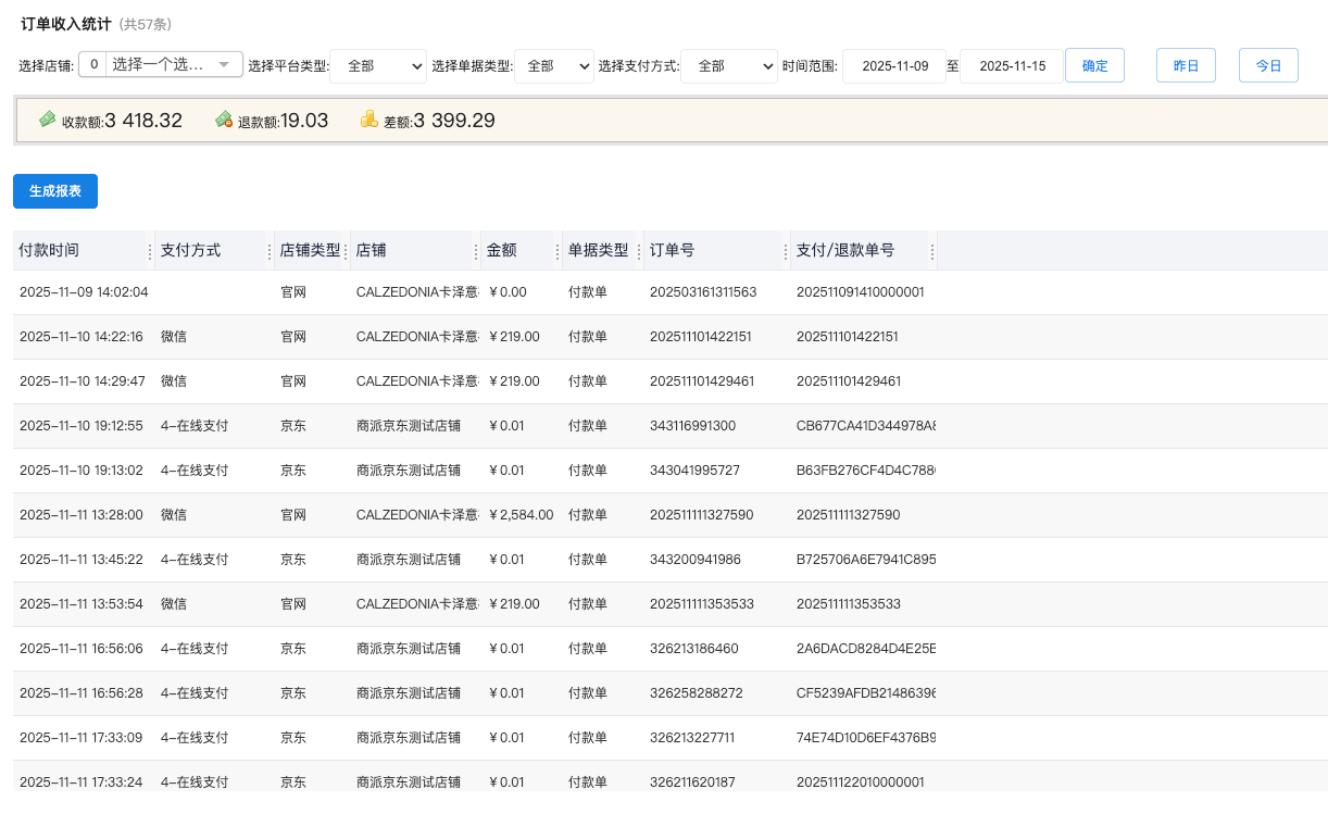 可按店铺、时间段、单据类型、支付方式、订单号、支付单号/退款单号维度筛选。