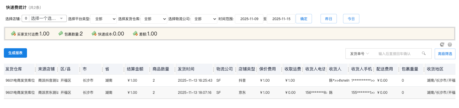 从收取客户运费“收取运费”与需要支付物流公司运费“配送费用”的对比角度出发,清楚的知道:“物流这块是赚钱了还是赔钱了”,也可用于与物流公司的对账参考 。