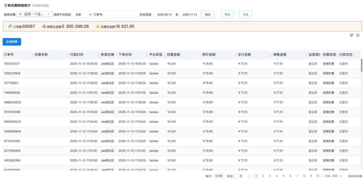 查看所有订单按优惠名称的优惠金额。可按店铺、平台、订单号、时间维度筛选