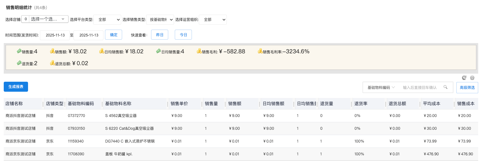 统计各个[基础物料](按不同规格统计)在期间段内实际的销售情况,退换货情况,并且根据销售时对应的成本进行核算,最终计算出单品在期间段内的毛利、毛利率水平。