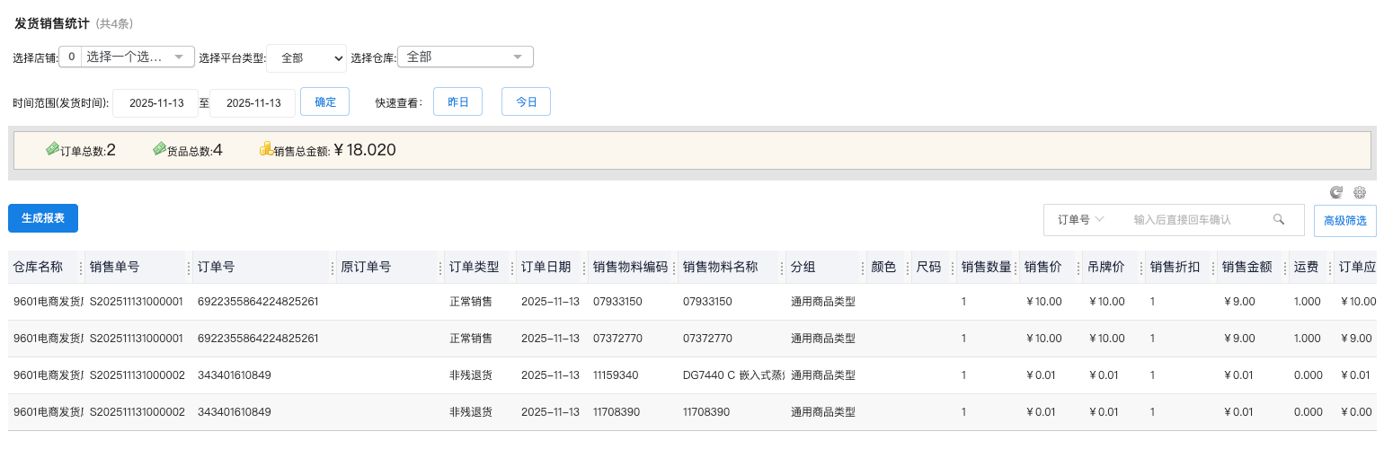 以发货出库产生的发货销售单维度统计仓和店的销售情况。